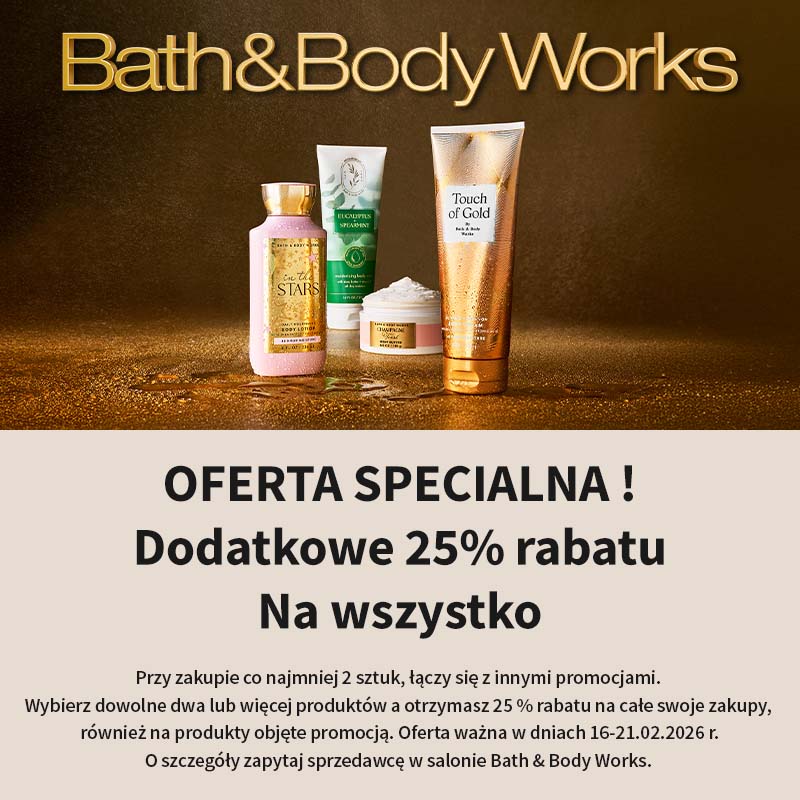 Dodatkowe 25% rabatu na wszystko. Przy zakupie co najmniej 2 sztuk, łączy się z innymi promocjami. Wybierz dowolne dwa lub więcej produktów a otrzymasz 25 % rabatu na całe swoje zakupy, również na produkty objęte promocją. Oferta ważna w dniach 16-21.02.2026 r. O szczegóły zapytaj sprzedawcę w salonie Bath & Body Works.”