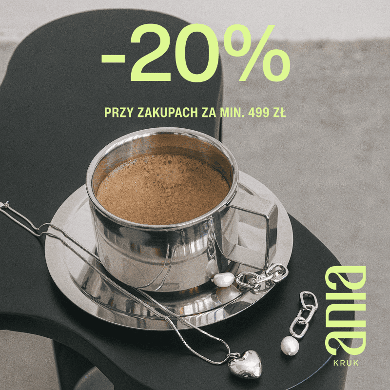 Planujesz większe zakupy? Nie będzie lepszego momentu niż teraz: -20% od 499 zł w ANIA KRUK! Promocja nie łączy się z innymi rabatami, zestawami, wyprzedażą, zakupem akcesoriów, karty podarunkowej lub e-vouchera.