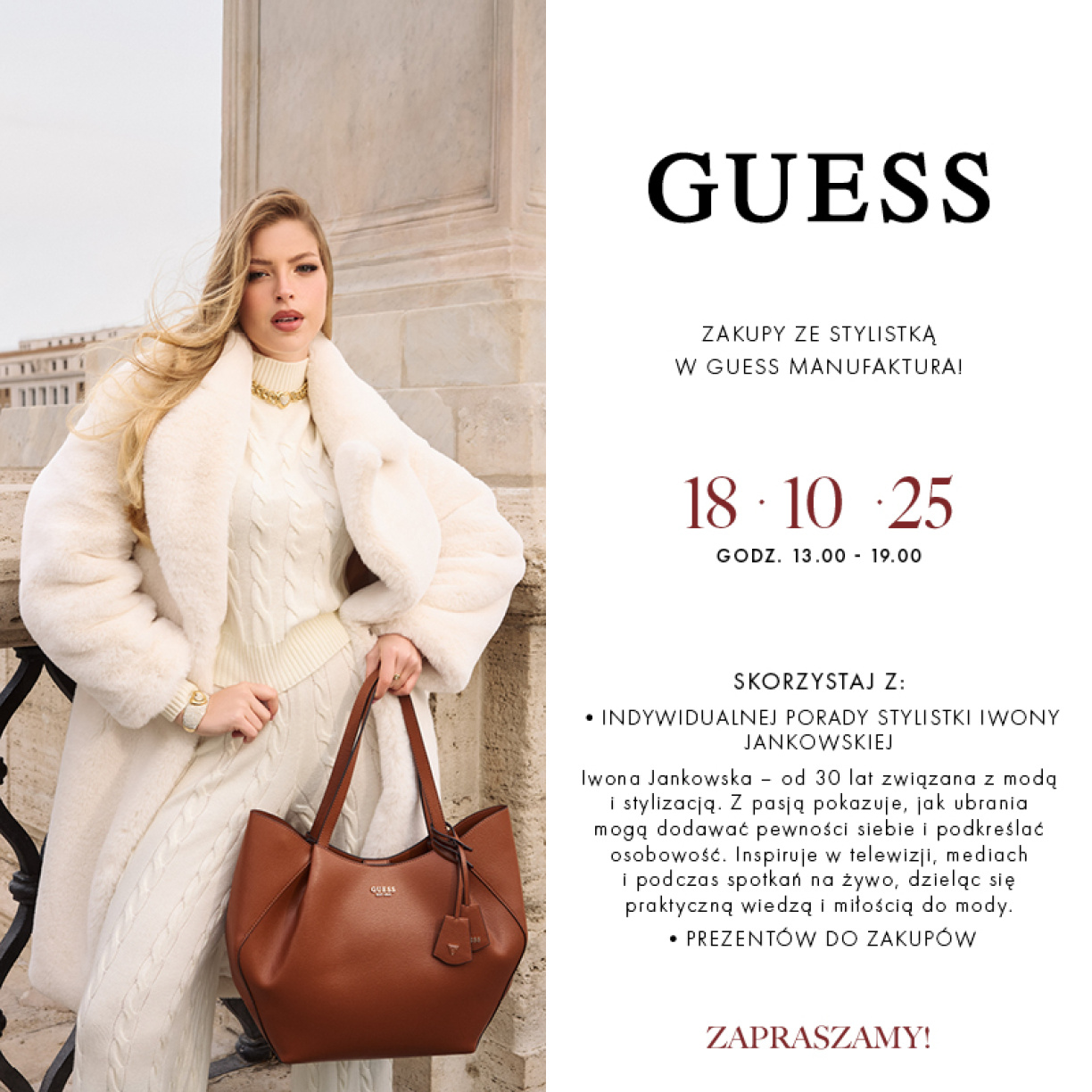 ZAKUPY ZE STYLISTKĄ W GUESS MANUFAKTURA! DATA: 18.10.2025 GODZ. 13:00 – 19:00 SKORZYSTAJ Z: • INDYWIDUALNEJ PORADY STYLISTKI IWONY JANKOWSKIEJ Iwona Jankowska – od 30 lat związana z modą i stylizacją. Z pasją pokazuje, jak ubrania mogą dodawać pewności siebie i podkreślać osobowość. Inspiruje w telewizji, mediach i podczas spotkań na żywo, dzieląc się praktyczną wiedzą i miłością do mody. • PREZENTÓW DO ZAKUPÓW ZAPRASZAMY!