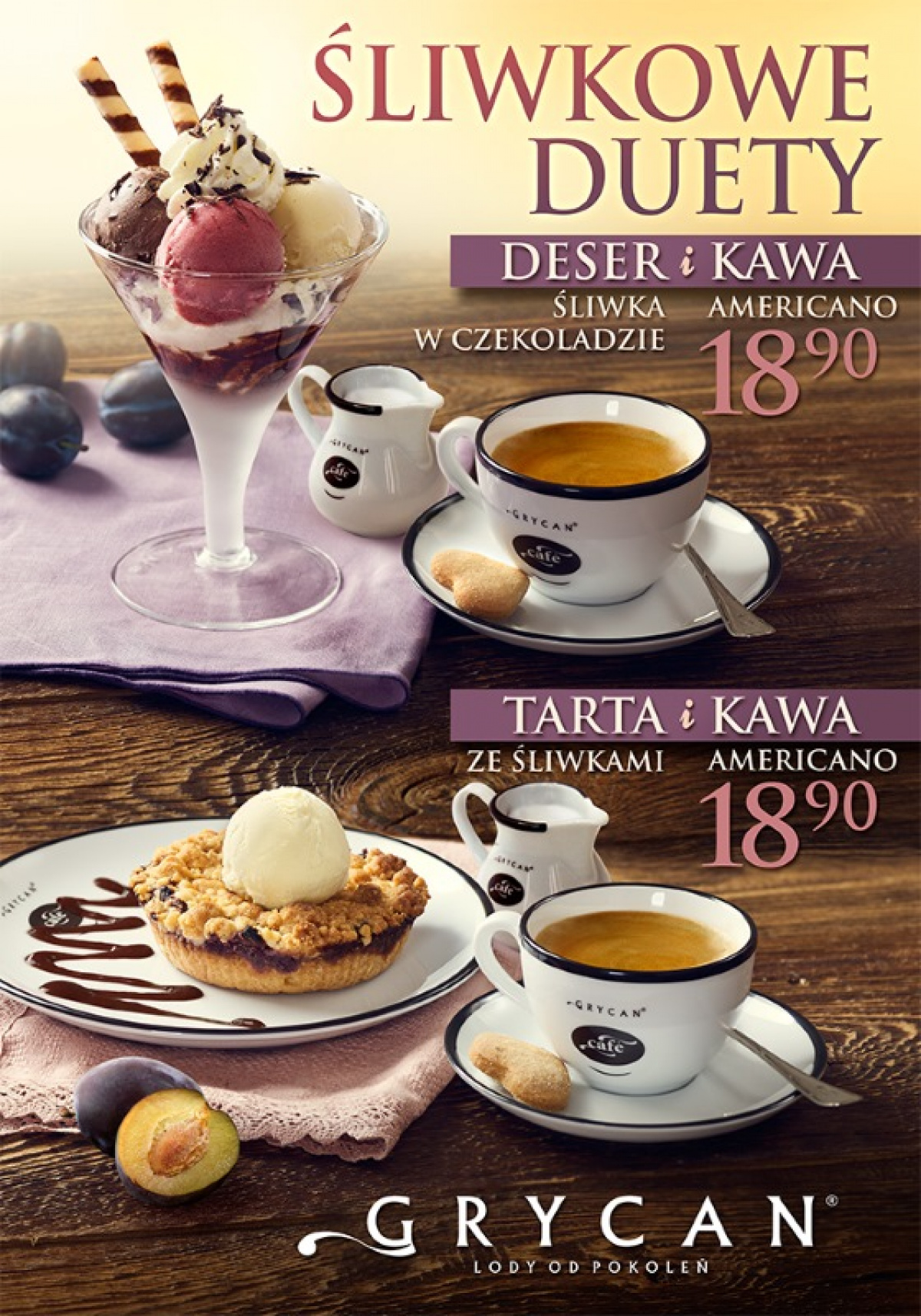 O tej porze śliwki smakują najlepiej! Sezon na nie trwa również w lodziarnio-kawiarniach GRYCAN LODY OD POKOLEŃ. Od 9 września we wszystkich lokalach sieci dostępne są ŚLIWKOWE DUETY, każdy w cenie 18,90 zł. Goście mają do wyboru deser Śliwka w czekoladzie z aromatyczną kawą Americano lub tartę ze śliwkami z kawą Americano.