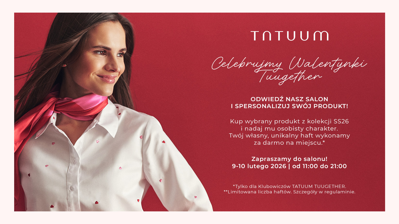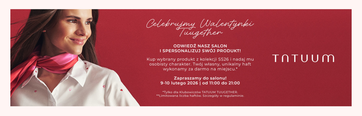 Warunkiem skorzystania z walentynkowej akcji jest posiadanie aktywnego członkostwa w Klubie TATUUM TUUGETHER, który powstał z myślą o osobach, świadomie wybierających ubrania ponadczasowe i wykonane z dbałością o detale. Dołączenie do społeczności TUUGETHER daje nie tylko benefity zakupowe w postaci bonów rabatowych, 10-letniej Gwarancji na ubrania i Dożywotniego Serwisu Napraw, ale również pewność, że ulubione rzeczy pozostaną w garderobie na dłużej. Klub lojalnościowy otwiera dostęp do dodatkowych korzyści i wydarzeń tworzonych w duchu ponadczasowej mody kapsułowej. Jedna osoba może skorzystać z jednego haftu, dostępnego dla pierwszych 100 klientów w każdym z wytypowanych sklepów.